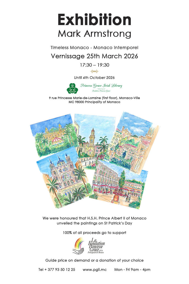 An exhibition of paintings by Mark Armstrong was inaugurated by H.S.H. Prince Albert II of Monaco on St Patrick's Day 17th March 2026. The vernissage (opening) for the public takes place on Wednesday 25th March 2026. Mark has donated 40 paintings of 'Timeless Monaco' - all the proceeds from their sale will benefit the Fondation Princesse Grace.