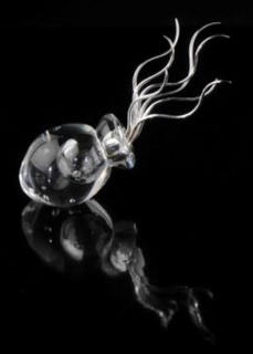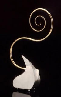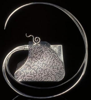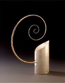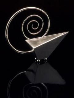 O'Dwyer's pieces carry their often extraordinary forms with the same assurance with which a snail carries its shell. A crazy arrangement if you think about it, but part of a lovely and integral visual balance. O'Dwyer can do sober too, with an austere and architectural Coffee Service without a curve in sight. His textured surfaces,which do interesting things with reflected light, are the antithesis of the usual high polish of silver. If you look closely you can see the influence of the Early Christian stone work that first inspired him when, at the age of 13, he moved from New York to Cashel, County Tipperary. It's not an obviously Celtic manifestation, but an adaptation of the flowing lines and textural qualities of stone.