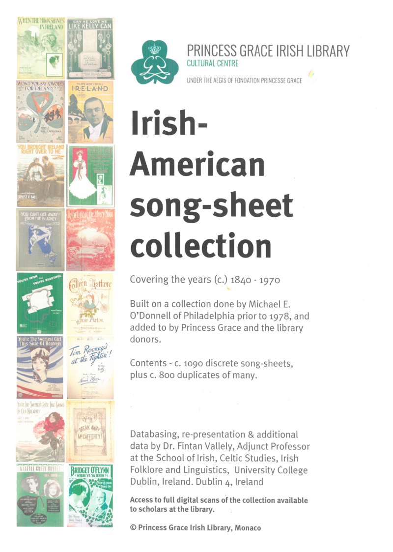 In 1978, H.S.H. Princess Grace of Monaco purchased a collection of more than 1,100 unique Irish and Irish American music scores, dating from 1840 to 1970, collected by Michael E O’Donnell who worked in the music industry in Philadelphia and New York, and who originated from County Mayo like the Princess’ grandfather. This was also fitting, since Grace Kelly's uncle Walter Kelly was a famous vaudeville actor in the early 1900s and had performed this kind of material in the United States of America, which no doubt influenced her choice of acting career.